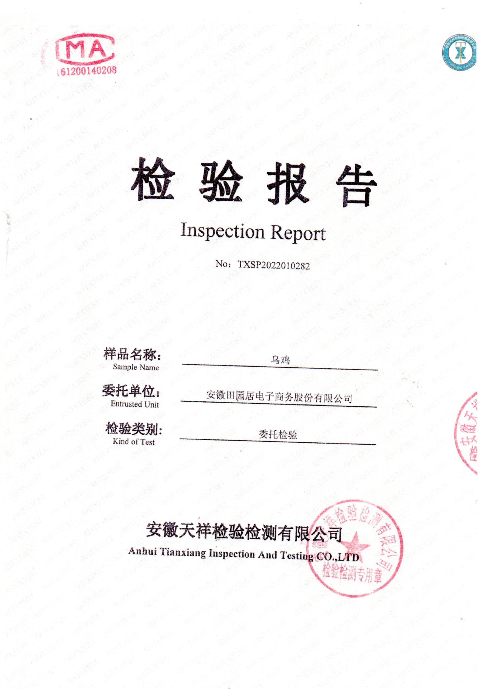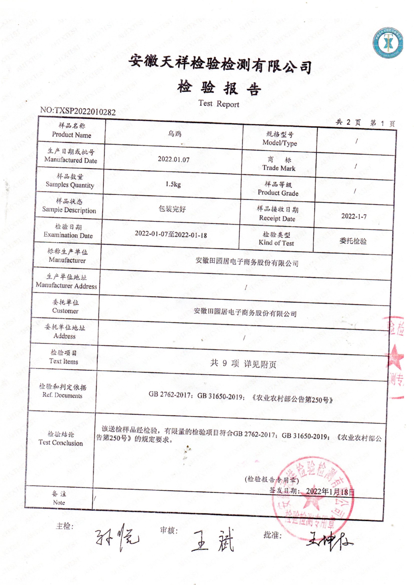 2022年01月烏雞檢測報告